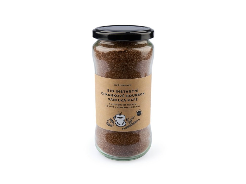 Výborná, zdravá náhrada kávy. Exkluzivní, lehce rozpustná kávovina ze 100% bio čekankového kořene, sušeného kokosového mléka a nejkvalitnějších jemně namletých lusků bourbonské vanilky. Vše v bio kvalitě. Jedinečná, luxusní chuť a vůně pro výjimečné zážitky s rodinou, přáteli nebo pro chvíle vlastního odpočinku. Výborná, zdravá náhrada kávy. Vhodná i při speciální dietě AIP.