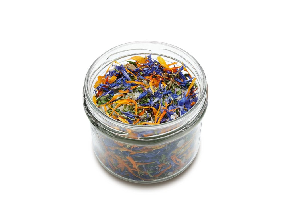 Tahle květová bylinná sůl je fajn, když chcete jídlo jen lehce dosolit, ale zároveň mu dát vůni bylinek a „něco navíc“ i vizuálně. Hodí se na brambory, zeleninu, vajíčka, do pomazánek, na pečivo s máslem nebo na dozdobení hotového jídla před servírováním.