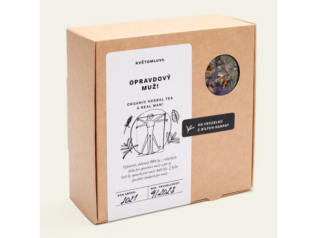 BIO čaj Opravdový muž se snaží být pro muže dokonalým svým složením bylin. Kotvičník zemní podporuje normální stav pohlavních orgánů, hormonální aktivity, funkce močové soustavy a například i energie – tělový a svalový tonus. Máta osvěží a pomůže s trávením. Šalvěj podporuje normální stav kostí a kloubů, přirozenou obranyschopnost a je antioxidantem. Agastache Anýzová dodá skvělou chuť. Dobromysl pomáhá zachovat si dobrou mysl, a uvědomění si, dělat dobré skutky. Okvětní lístky slunečnice připomínají, že opravdový muž je čestný a pravdomluvný. A až uvidíte v čaji okvětní lístky růže, vzpomeňte si, že opravdový muž je i milující a něžný ke své ženě, plný lásky ke svým dětem, citlivý a plný porozumění ke svým přátelům a odpouštějící nepřátelům.